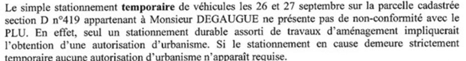 Or, il est évident que le parking, même temporaire, est contraire aux caractéristiques, à la définition et au règlement de la zone N du PLU, comme vu plus haut. Aucun des articles du règlement de la zone N ne fait de distinguo entre les aménagements temporaires et définitifs.
